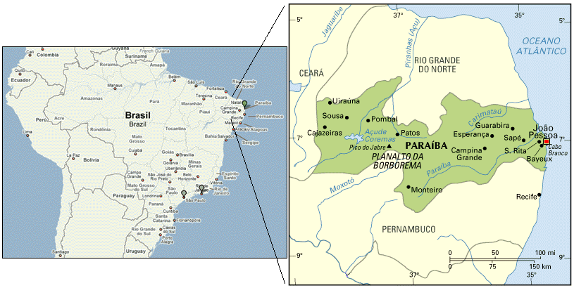 Map of Brazil and the state of Paraíba. The red square indicates the geographic region of the city João Pessoa.